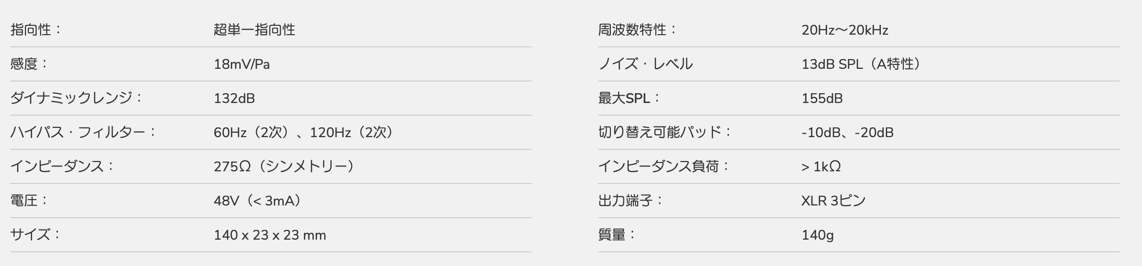 クラス最高のノイズ・レベル13dB(A)と驚異的な155dB SPLにより圧倒的なダイナミックレンジをもたらし、そしてスーパーカーディオイド指向性によりターゲット・サウンドをクリアにキャプチャ可能です。これにより、アンダーヘッド、ライド、ハイハットなどのドラム、静音性が重要なバイオリン、フルート、クラシックギター、ビブラフォン、ハープ、フォーリーなどにも理想的なマイクロフォンに仕上がっています。さらに、出荷される個体感度差は全て1kHzで±0.5dB以内にキャリブレートされているため、どの2本を組み合わせてもステレオ・ペアとして利用可能です。