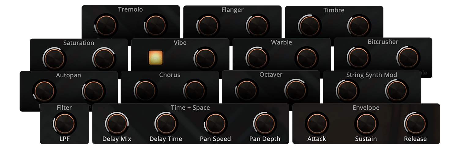 加えて合計80種類のプリセットと本作専用のMIDIライブラリを収録しています。ガラスのようなピアノ風トーン、力強いリードやベース、温かみのあるアナログ・パッドなどの音色を用意しています。各プリセットには独自のコントロールが用意されており、パラメータを自在に調整して音作りが可能です。