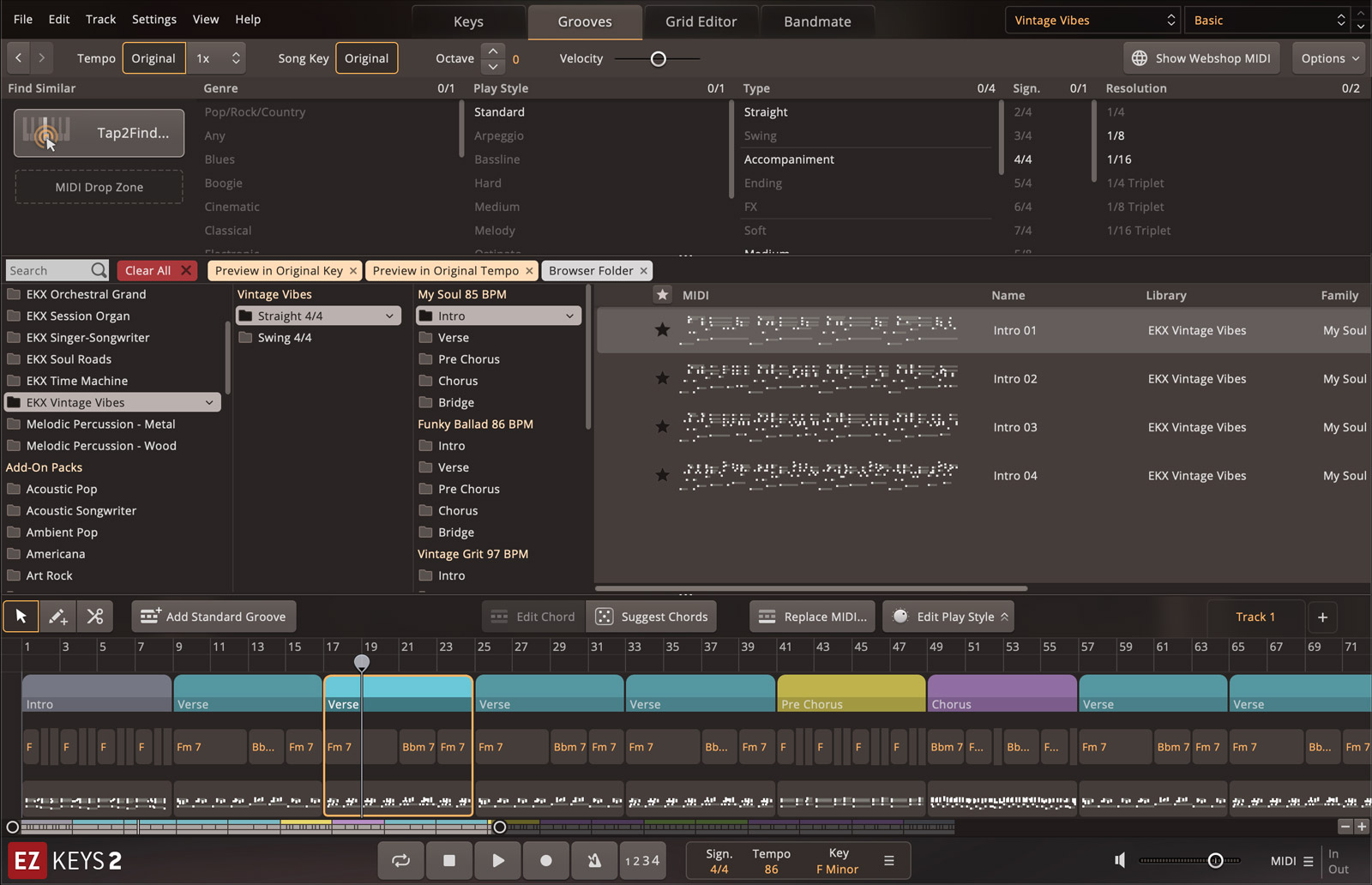 本製品専用に制作されたMIDIコレクションを多数収録しています。これらのMIDIは、サウンドの可能性を探求する際の出発点として、また創作のインスピレーション源としてご活用いただけます。もちろん、『EZkeys 2』に搭載された多彩なMIDI編集機能を使えば、これらのアイデアをさらに発展させ、ご自身の楽曲にマッチさせることができます。