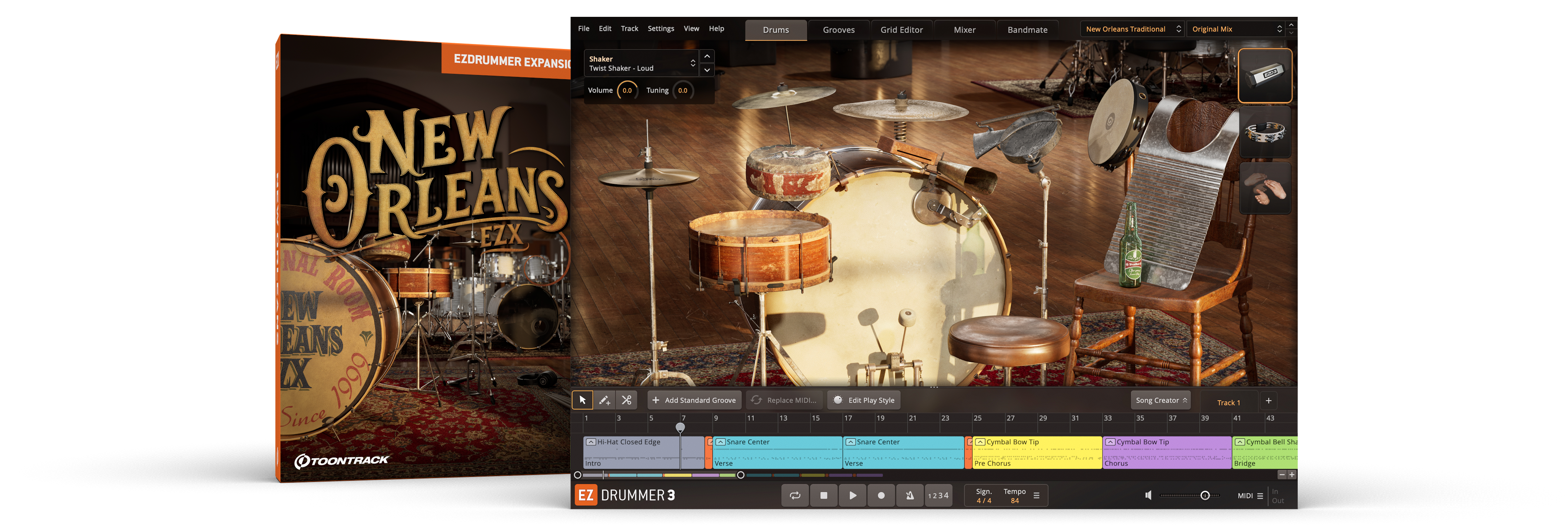 本製品はニューオーリンズで最も著名なドラマーの一人である Terence Higgins(Dr. John、Allen Toussaint、Dirty Dozen Brass Band)によって演奏・サンプリングされ、マルチアワード受賞エンジニア/プロデューサー/ミキサーである Misha Kachkachishvili によって、彼の Esplanade Studios で収録されました。
